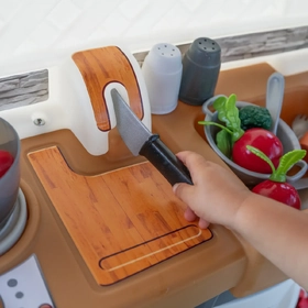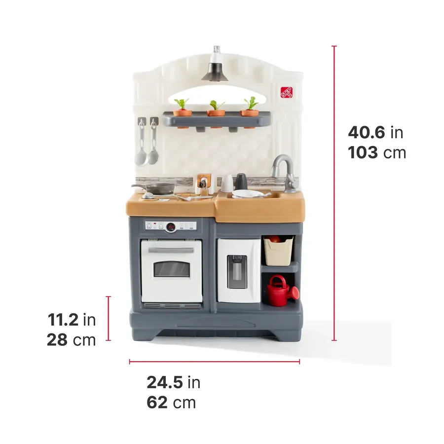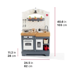 Imagination will boil over as your little ones prepare their favourite meals with the Timeless Trends Kitchen! With so much to explore from top to bottom gross and fine motor skills will get a workout as toddlers simmer strain stir and scramble their way around their very own play kitchen. Thoughtfully designed with a beautiful neutral colour palette modern amenities like the farmhouse-style sink faux slate faucet and appliance pulls and faux tile backsplash this play kitchen for toddlers features todays on-trend design aesthetic coupled with the timeless appeal of open-ended play kids have been enjoying for generations. Support the different stages of toddler development with this play kitchen as the backdrop featuring engaging opportunities for social play with friends as well as plenty to do during solo play too. Make coffee for guests with the included coffee station and cook up something delicious with the special stovetop burner with real lights and sounds! When playtime fun is done store accessories in the windowed cabinet and other built-in storage areas to keep them close for next time. Made in the USA of US and imported parts.