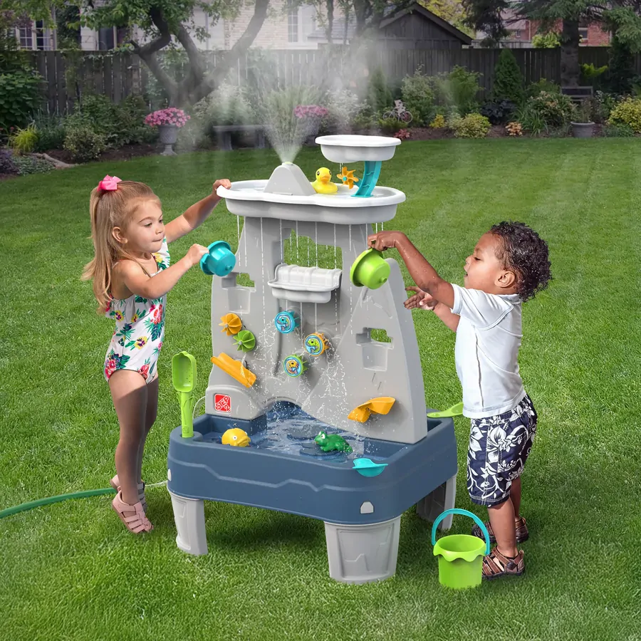 Turn every sunny afternoon into an adventure with the Misting Mountain & Waterfall™. This water table grows right along with your child, starting low to the ground for early exploration and raising as their curiosity and confidence grow. At the top, a gentle mist and waterfall tray send streams of water raining down both sides of the play table, creating space for multiple kids to engage. The flowing water keeps little minds engaged at every turn, helping kids learn how movement, flow, and gravity connect through hands-on play. This backyard water toy encourages sensory fun that builds coordination, sparks problem-solving, and inspires creativity that grows with them.